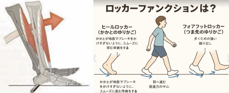 このロッカーファンクションがスムーズに働くことで、私たちは少ない力で楽に歩けます。逆に、足首が硬かったり筋力が弱かったりすると、この「ゆりかご」が上手く使えず、歩幅が狭くなったり疲れやすくなったりします。